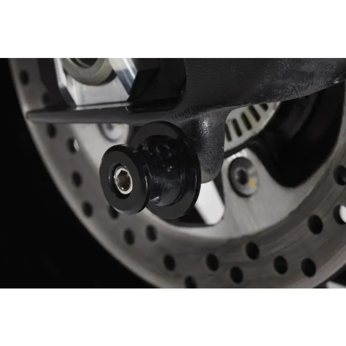 Met deze zwarte bobbins met grote adapters zet je de motorfiets gemakkelijk en zonder krassen op een paddock stand.Set van twee stuks.