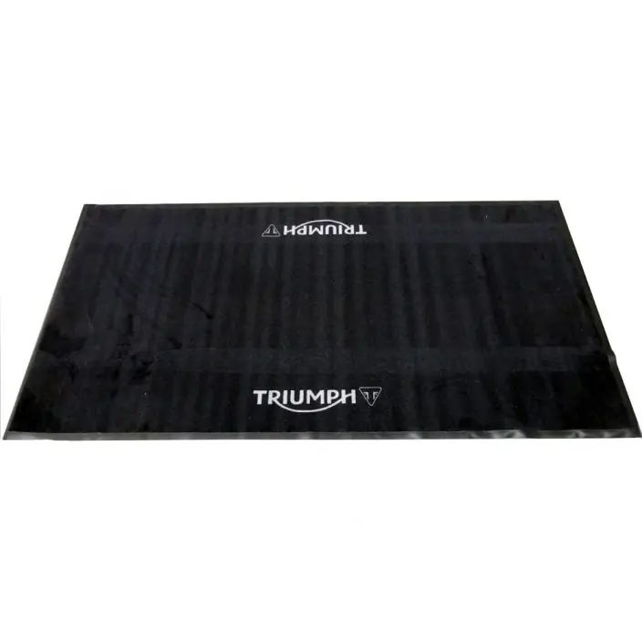 Triumph-garagemat van hoge kwaliteit, gemaakt van duurzaam 3mm-nylon met een PVC-achterlaag van 2 mm en volgens FIM-vereisten. De mat is voorzien van dubbele grijze Triumph-logo’s op een zwarte achtergrond. Afmetingen: 200 cm x 100 cm.